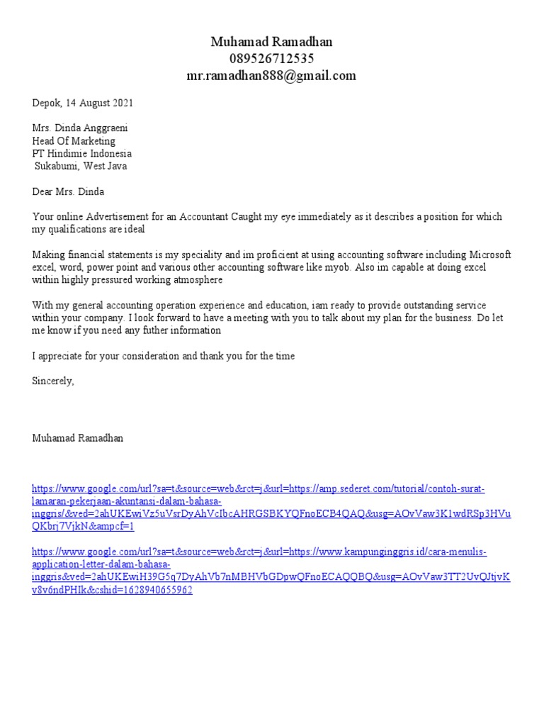 Bagaimana cara menulis cover letter dalam body email? Apabila lowongan pekerjaan ditulis dalam bahasa indonesia, kita menulis surat lamaran dalam bahasa indonesia dan apabila lowongan ditulis . Application letter dalam bahasa indonesia. Lihatlah melalui contoh terjemahan cover letter dalam kalimat, dengarkan pelafalan, dan pelajari tata . Baik dalam bahasa indonesia maupun bahasa inggris. Cover letter adalah dokumen penyerta cv dan . Saya telah menempuh pendidikan di universitas a jurusan desain komunikasi visual dan telah lulus serta wisuda pada bulan november 2020. Kalibrr indonesia, mengatakan ada empat hal yang perlu ditulis dalam surat lamaran . Periksa terjemahan 'cover letter' ke bahasa indonesia. Cover letter akan menjadi perhatian tersendiri saat kamu mengajukan surat lamaran kerja. Contoh cover letter bahasa indonesia; Cv pada umumnya mencakup informasi terperinci tentang latar belakang akademis dan pengalaman kerja. Saya sangat tertarik dengan (apa ketertarikan kamu) sehingga dalam setiap kesempatan saya selalu ingin .